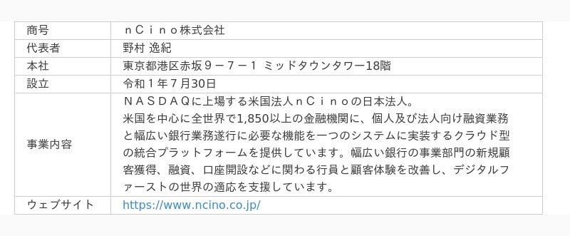 お客さまへの更なる価値提供及び職員の働き方改革・エンゲージメント向上を目的に、次期「顧客管理/渉外活動支援/融資業務支援システム」としてnCino株式会社(東京都港区赤坂9丁目、代表取締役社長:野村逸紀)が提供するクラウド型銀行業務統合プラットフォームを採用することを決定いたしましたので、下記のとおりお知らせします。なお、事業性融資領域における同プラットフォームの全面的な採用は国内初となります。