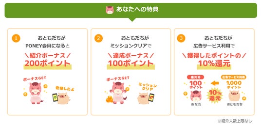 1.キャンペーン期間中におともだちがPONEYに会員登録すると紹介ボーナス200ポイントプレゼント。