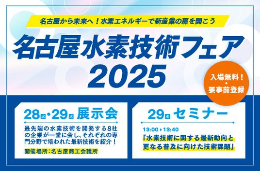 水素エネルギーの普及促進を図るため、名古屋市経済局主催の水素技術や水素利活用に向けた取り組みなど、特色ある技術・製品を有する企業が出展する展示会「名古屋水素技術フェア」が名古屋商工会議所にて2025年1月28日(火)~1月29日(水)に開催されます。水素の利活用や水素産業への参入に関心がある方、水素に興味がある方など、この機会に水素エネルギーへの関心、理解を深めていただきたいと考えております。ぜひご来場ください。