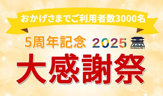 オンライン韓国語教育サービスを提供するハングルネット(本社:東京都中央区銀座1丁目22-11、代表:佐々木貴子)は、サービス提供開始5周年を記念し、ユーザー様への感謝の意を表して“大感謝祭”を実施中です。第一弾として、体験レビューをSNSに投稿していただいた方の中から審査を経て1名様に「韓国語レッスン1ヶ月無料受け放題」をプレゼントするコンテストを開催します。
