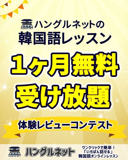 [体験レビューコンテスト]:ハングルネット5周年記念感謝祭第一弾!ハングルネットのレッスン体験レビューをSNSに投稿すると、【韓国語レッスン1ヶ月無料受け放題】など豪華賞品をプレゼント。