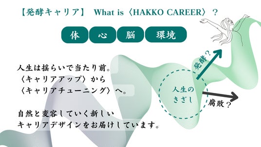 『発酵キャリア(TM)️』は、変化が前提の現代社会において、一人ひとりの人生を「発酵」というメタファーでとらえ直す、新たなキャリアチューニング・ライフデザインの手法です。弊社代表が5000人以上のキャリアやビジネスの支援をする中、過渡期の時期こそ自己効力感が大事だが、短絡的に「成功」「失敗」と定義付けて人生を捉えると自ら落ち込み、過渡期を長期化させてしまう方が多い点、また過渡期のガイドが足りない点に着目。そこを根本的に解決するべく、中長期目線でウェルビーイングな過渡期の在り方を体系化。身体・心・脳・環境の4つの視点を丁寧に紐解き、自分にとって美味しい人生への指針を提示する。