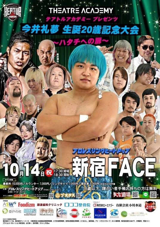 プロレスリング・ヒートアップは、2024年10月14日(月・祝)に新宿FACEにて、「テアトルアカデミーpresents 今井礼夢 生誕20歳記念大会 ~ハタチへの扉~」 を開催いたします。