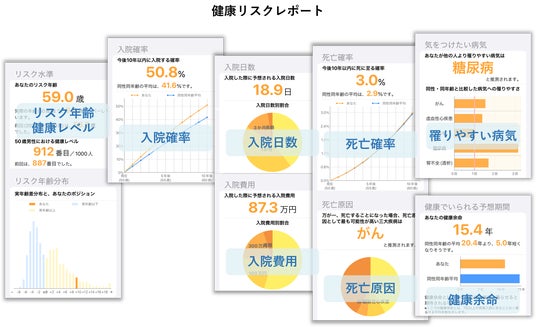 マイリスクは、健康診断結果や既往歴、生活習慣をもとに入院確率や健康余命など多様な健康リスクを予測するサービスです。30項目を超える検査結果から本人の健康特性を反映した、入院リスクや疾病リスク、健康余命など、わかりやすく実感できる健康リスクを提示しています。