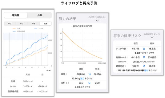 アプリでは日々の運動が将来の体重や健康リスクにどのように影響するか毎週レポートされ、頑張った成果を実感できるようになります。