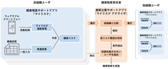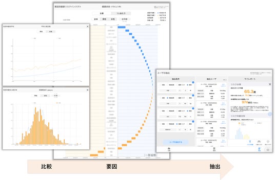 - 健康状態を他の組織と比較し、健康リスクの要因を特定し、改善余地の大きなユーザを抽出する健康施策立案サポートアプリ