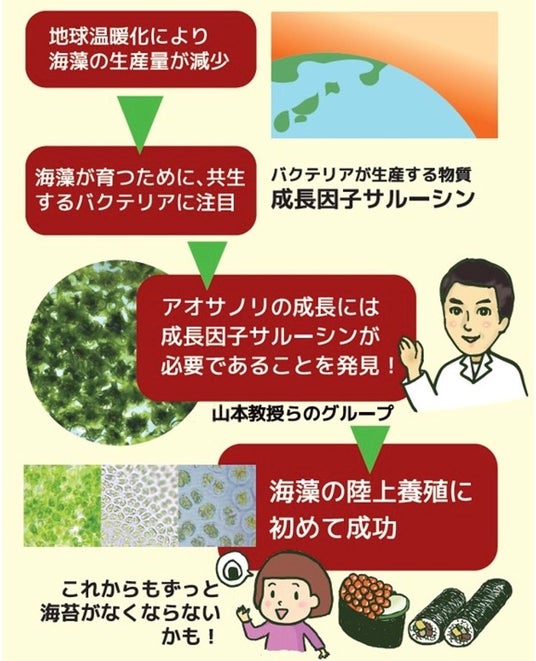 海藻が育つ仕組みは分かっていませんでしたが、本学山本教授らのグループは、海藻に着生している、バクテリアに注目し、バクテリアが生産する物質(成長因子サルーシン)がアオサノリ(ヒトエグサ)の成長に必要であることを発見しました。