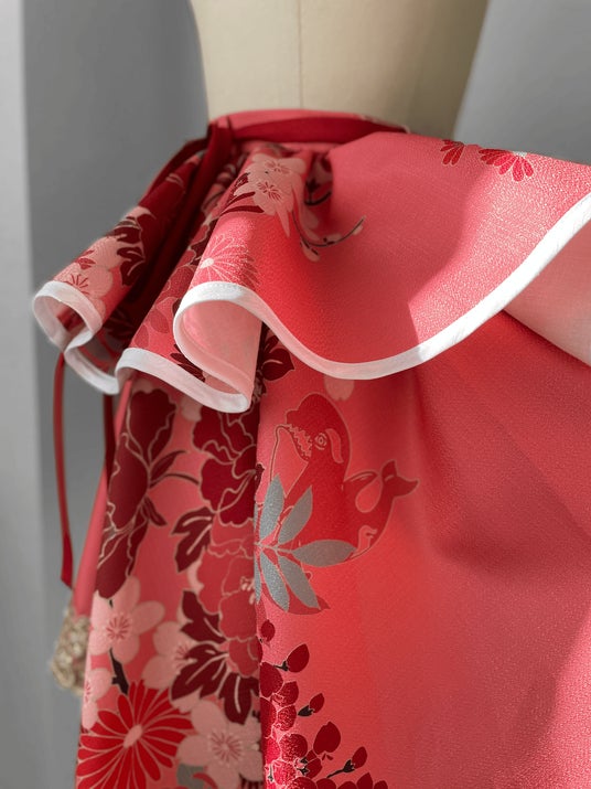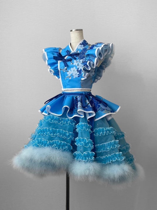お正月らしい和の衣装は、オリジナルの和柄の生地に「シャチ」のロゴマークを取り入れ、特別感あふれるデザインにしました。また、動いた時にきれいに広がるボリューム感のあるスカート、袖のフレアにはたっぷりと生地を使い動きがでるようにし、ライブパフォーマンスでTEAM SHACHIの個性を表現できる衣装に仕上げました。