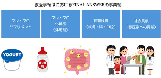 株式会社FINAL ANWER(https://final-answer.co.jp)は、神奈川県茅ヶ崎市にて、同社のグループであり、動物病院向けの細菌検査・動物病院経営・メディア/教育事業など、多岐に渡る獣医学領域の展開を行ってきた(株)1 sec社のノウハウを元に、獣医学領域ではカバーできないヘルスケア領域をカバーし、動物たちの最後の答え(FINAL ANSWER)となることを目標に2021年に設立されました。ペットの生活習慣の多様化や長寿化がはじまった社会を迎え、ただ獣医学的治療や高度医療サービスを提供するのではなく、動物にとって、そしてご家族にとって快適な日々を過ごしていただけるのかを追求してまいりました。その結果、近年、注目の研究である腸内をはじめとする常在細菌叢およびその環境をコントロールできるプレ・プロを用いたヘルスケア分野に着目し、新たな事業展開を開始しました。