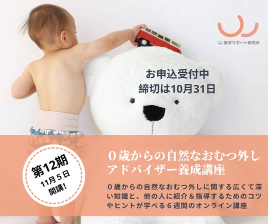 こどもと家族の排泄サポート研究所(所在地:神奈川県足柄上郡、代表:和田智代)は、ストレスの少ない自然なおむつ外しの研究を行ってきました。従来の方法では子どものおむつが外れずに悩む親や保育士が急増しているためです。研究の結果生まれたのが「0歳からの自然なおむつ外しアドバイザー養成講座」。その第12期が11月5日からスタートします。現在申込受付中。締め切りは10月31日です。