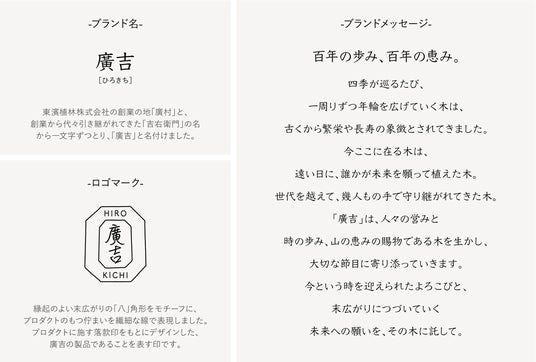 「廣吉(ひろきち)」は樹齢百年のヒノキでつくるプロダクトシリーズです。東濱植林株式会社の創業の地「廣村」と、創業から代々引き継がれてきた「吉右衛門」の名から一文字ずつとり、「廣吉」と名付けました。