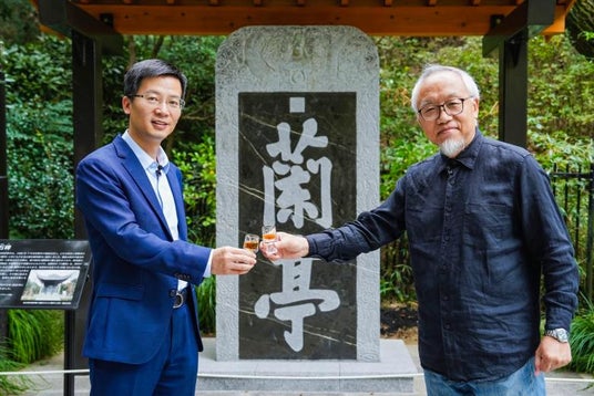 蘭亭という石碑の前で、神戸国際大学教授の毛丹青氏が会稽山紹興酒株式会社社長楊剛氏と深く対談しました。中国の紹興酒とその文化について話すとき、毛丹青氏は「これを聞くと血が沸騰し、涙が溢れてくるような気分さえする」と語りました。楊社長は、将来には日本の方々と手を携えて日中の酒文化の交流と継承を共同で促進し、両国の友好関係に明るい彩りを添えることを楽しみにしていると述べました。