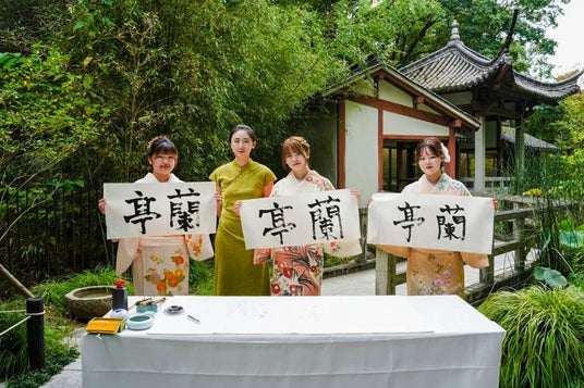 西宮市の北山緑化植物園にある小さな蘭亭の石碑で、日本女子学生3名が集まり、中国の書道の先生と書道について交流し、筆致に込められた中国文化が墨の香りに染まり、最後に豊かで優雅、そして深い意味を持つ「蘭亭」という言葉が紙面に現れます。