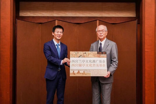西宮市と紹興市は、互いに酒造業が盛んであるという共通点が縁となり、1985 年に姉妹都市として締結して以来、密接な関係と協力を続けており、文化、教育、経済などの分野において、双方に多大な成果を上げて参りました。両市の友好関係の促進を目的とし、紹興酒と書聖である王羲之(オウ・ギシ)が残した蘭亭文化の普及に向けて協力関係を築くため、紹興酒のリーダー企業である会稽山紹興酒株式会社が西宮・紹興友好交流協会へ「西宮蘭亭文化普及基金」の贈呈を行い、蘭亭雅宴(らんていがえん)を開催しました。