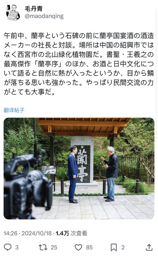 神戸国際大学教授の毛丹青氏のXにより