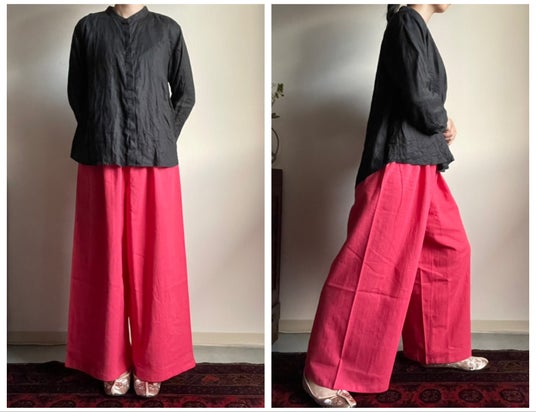 日本製ハーフリネンを使用したビビッドなピンクが目を惹く新作。形はワイドとテーパードの2タイプ、サイズはS/M/Lを展開。数量限定となっており、製品廃棄ゼロを掲げて原則受注生産制での販売。