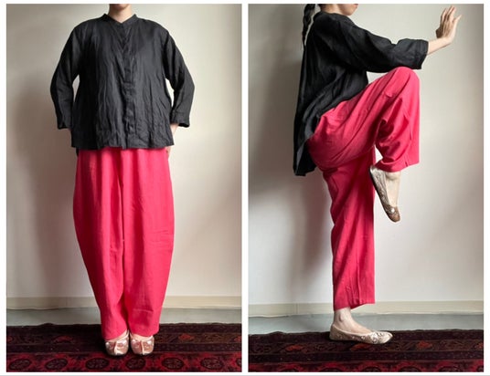 10年来の中国武術愛好者であった代表は、ある年齢から化学繊維とロックミシンによる縫製糸の刺激で肌がかゆくなるようになり、2021年頃から天然素材の太極拳パンツを独学で作り始める。