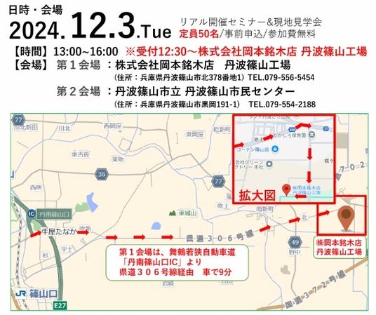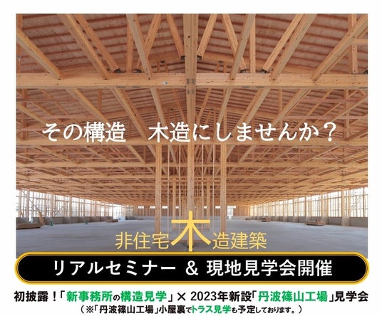 株式会社 岡本銘木店(本社:大阪府吹田市、代表:佐藤 朋子)は、2024年12月3日(火)に丹波篠山市で「非住宅木造建築リアルセミナー & 現地見学会」を開催いたします。初めて公開される「新事務所の構造見学」や、2023年に新設された「丹波篠山工場」の見学会(「丹波篠山工場」の小屋裏でトラスの見学も予定)を行います。また、講演会では、株式会社木構造デザインの代表取締役社長 福田浩史氏とティンバラム株式会社の執行役員東京営業部長 足立雅一氏を講師に迎え、木造建築の専門家によるS造・RC造から木造への切り替えポイントや、木造4階建てビルの事例についてご説明いただきます。木造建築の新時代における戦略や展望についても語っていただきます。