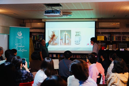 トルコチャイの歴史的背景や年間の消費量を学んだ後、伝統的な2段式やかんで淹れ方を実演