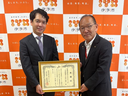 左:西予市長 管家 一夫氏、右:有限会社アクアテック 代表取締役 大和田 健斗