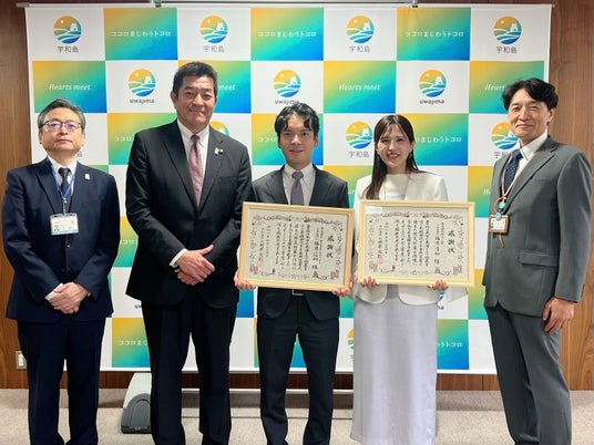 中央左より:宇和島市長 岡原 文彰氏 、有限会社アクアテック 代表取締役 大和田 健斗、有限会社アクアテック 秘書 坂東 麻利
