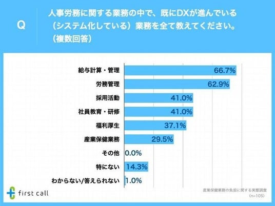 - DXが進んでいる業務は「給与計算・管理」(66.7%)、「労務管理」(62.9%)。