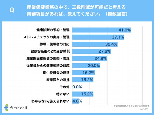 加えて、「産業保健業務の中で、工数削減が可能だと考える業務項目」を調査したところ、「健康診断の予約・管理」が41.9%、「ストレスチェックの実施・管理」が37.1%、「休職・復職者の対応」が32.4%となりました。