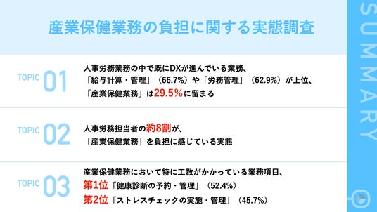 その背景には、人事労務領域のDX化(運用効率化)において、産業保健業務が遅れており、アナログな運用で人事労務担当者の負荷になっていると考えられます。