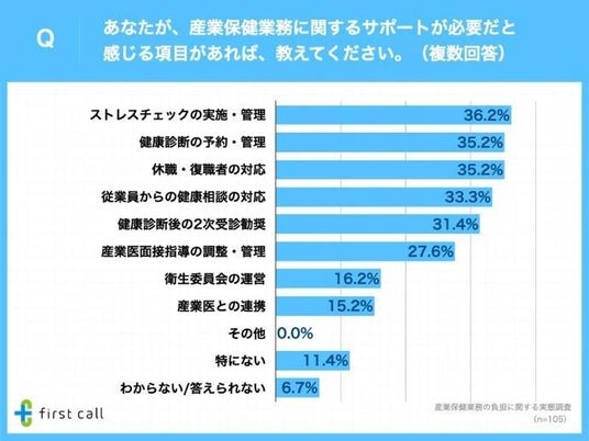 さらに、「産業保健業務に関するサポートが必要だと感じる項目」に関しては、「ストレスチェックの実施・管理」が36.2%、「健康診断の予約・管理」、「休職・復職者の対応」が35.2%となりました。