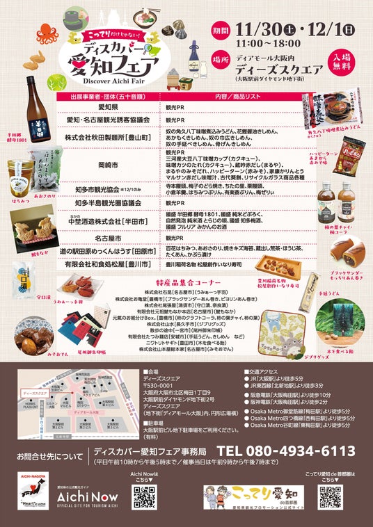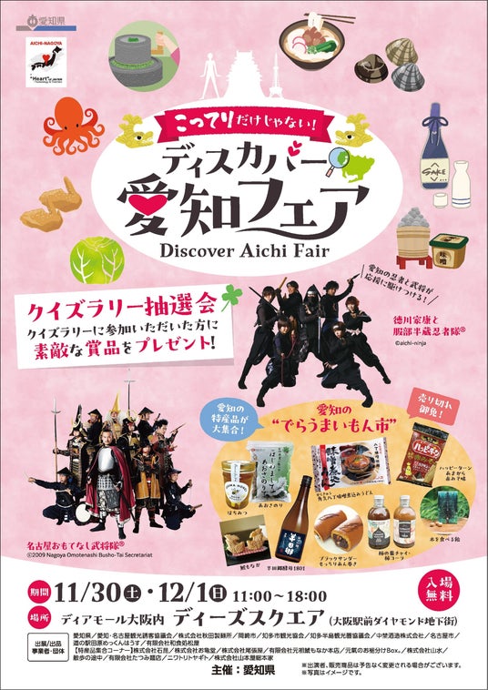 愛知県では、関西圏在住の方に向けて、本県の多彩な食と観光の魅力をPRし、誘客を促すことを目的に、関西圏において愛知の観光物産展「こってりだけじゃない。ディスカバー愛知フェア」を以下のとおり開催しますのでお知らせします。