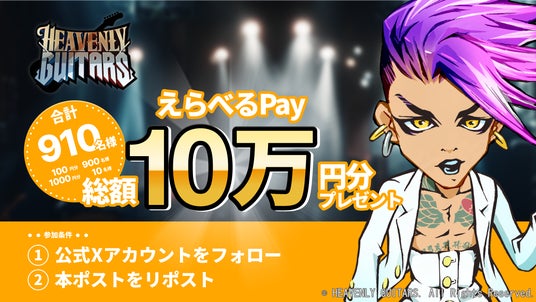 エレキギターにフォーカスした対戦型音楽ゲーム『Heavenly Guitars(以下本作)』を2025年5月にリリース予定であるソネットゲームスタジオ株式会社(所在地:東京都品川区、代表取締役社長:永田博丈、以下当社)は、本日より総額10万円を910名様にえらべるPayをプレゼントするXキャンペーンを開催することをお知らせいたします。
