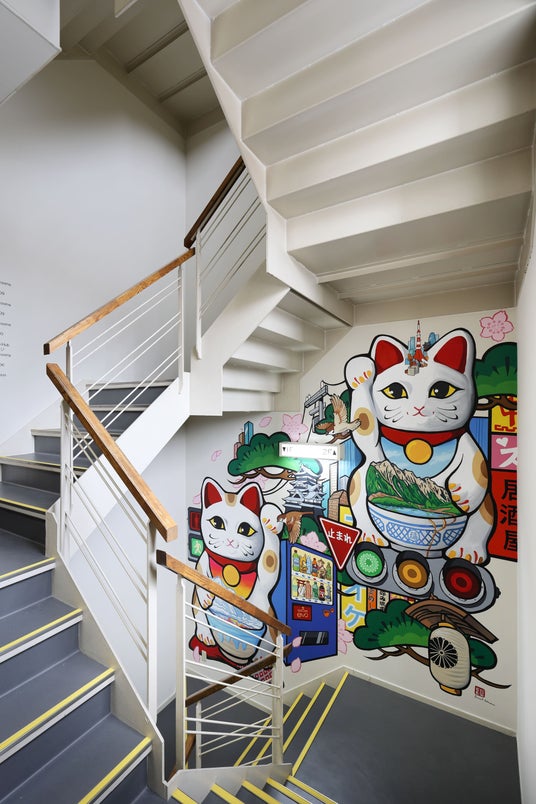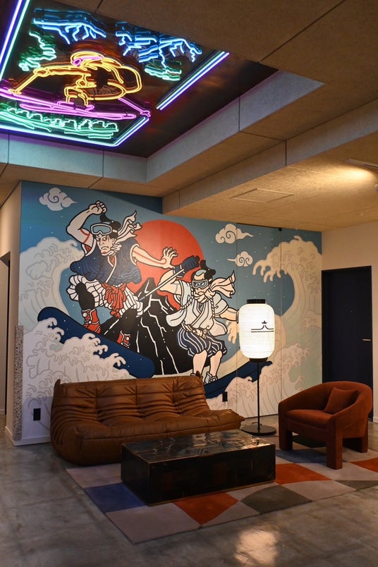 受付の正面エリア:和とアメリカンポップのモチーフを融合させたアーティストBEYTAROによる作品。白馬の背景をイメージしたスキーのオンサインは、Vyvial Suzuki Studioのオリジナルデザインです。