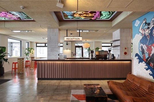 一階部分に設けられた新しいオープンラウンジでは、ゲスト同士の交流を促すバーと店舗エリアを備えています。この空間は、既存の古いタイルカーペットを撤去し、その跡が残るコンクリート床を露出することで、歴史を物語る独特の雰囲気を大切にしました。