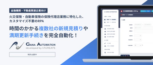 株式会社アイ・エフ・クリエイト(本社:東京都立川市、代表取締役:小川真一)は、火災保険や自動車保険の保険業務の効率化と生産性向上を支援する業界特化型RPAサービス「GAINA Automation RPA」(https://www.ifcreate.com/gaina_automation/)をリリースしました。本サービスは、煩雑な定型業務となっている継続・新規契約 見積作成・申込書作成・計上業務を完全自動化し、保険代理店に向けたソリューションを提供します。