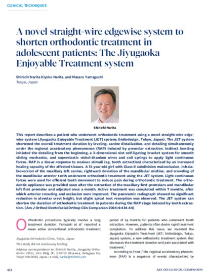 [1] Shinichi Narita, Kiyoko Narita, and Masaru Yamaguchi, “A novel straight-wire edgewise system to shorten orthodontic treatment in adolescent patients: The Jiyugaoka Enjoyable Treatment system” AJO-DO Clinical Companion December 2024 Volume 4 Issue 6 p434-444