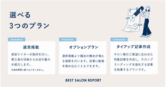 BEST SALON REPORTでは、サロンブランディングや新規集客につながる3つのプランを提供しています。サロン様の目標に合わせて最適なプランをご提案します。