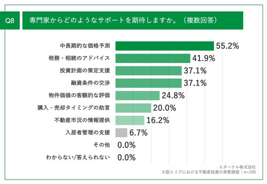 Q7で「受けている」「今後受けたいと思っている」「受けたことはないが、興味はある」と回答した方に、「Q8.専門家からどのようなサポートを期待しますか。(複数回答)」(n=105)と質問したところ、「中長期的な価格予測」が55.2%、「税務・相続のアドバイス」が41.9%という回答となりました。