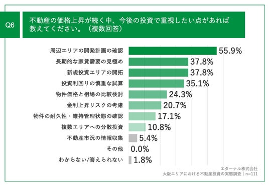 「Q6.不動産の価格上昇が続く中、今後の投資で重視したい点があれば教えてください。(複数回答)」(n=111)と質問したところ、「周辺エリアの開発計画の確認」が55.9%、「長期的な家賃需要の見極め」が37.8%、「新規投資エリアの開拓」が37.8%という回答となりました。