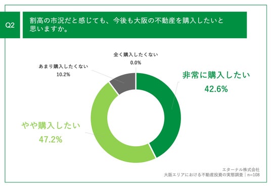 Q1で「非常に感じる」「やや感じる」と回答した方に、「Q2.割高の市況だと感じても、今後も大阪の不動産を購入したいと思いますか。」(n=108)と質問したところ、「非常に購入したい」が42.6%、「やや購入したい」が47.2%という回答となりました。