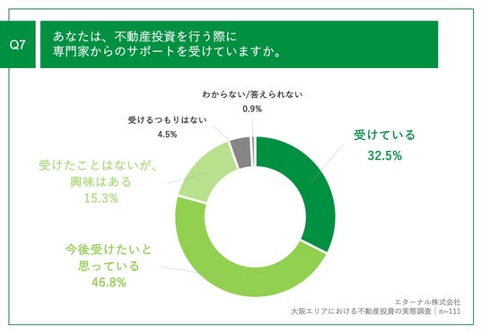 「Q7.あなたは、不動産投資を行う際に専門家からのサポートを受けていますか。」(n=111)と質問したところ、「受けている」が32.5%、「今後受けたいと思っている」が46.8%、「受けたことはないが、興味はある」が15.3%という回答となりました。
