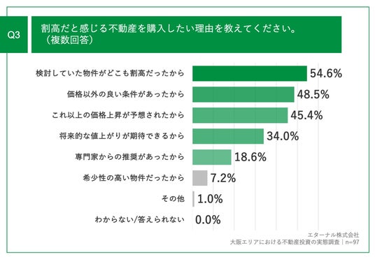 Q2で「非常に購入したい」「やや購入したい」と回答した方に、「Q3.割高だと感じる不動産を購入したい理由を教えてください。(複数回答)」(n=97)と質問したところ、「検討していた物件がどこも割高だったから」が54.6%、「価格以外の良い条件があったから」が48.5%、「これ以上の価格上昇が予想されたから」が45.4%という回答となりました。