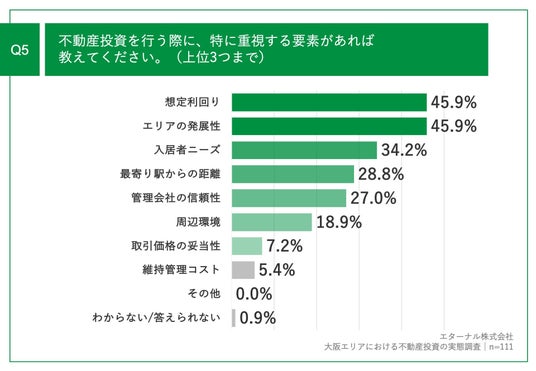 「Q5.不動産投資を行う際に、特に重視する要素があれば教えてください。(上位3つまで)」(n=111)と質問したところ、「想定利回り」が45.9%、「エリアの発展性」が45.9%、「入居者ニーズ」が34.2%という回答となりました。