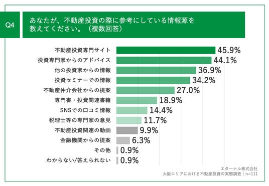 「Q4.あなたが、不動産投資の際に参考にしている情報源を教えてください。(複数回答)」(n=111)と質問したところ、「不動産投資専門サイト」が45.9%、「投資専門家からのアドバイス」が44.1%、「他の投資家からの情報」が36.9%という回答となりました。