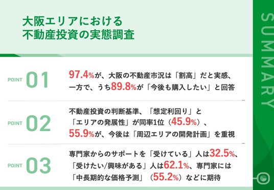 - 01|97.4%が、大阪の不動産市況は「割高」だと実感、一方で、うち89.8%が「今後も購入したい」と回答
