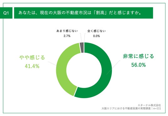 「Q1.あなたは、現在の大阪の不動産市況は「割高」だと感じますか。」(n=111)と質問したところ、「非常に感じる」が56.0%、「やや感じる」が41.4%という回答となりました。