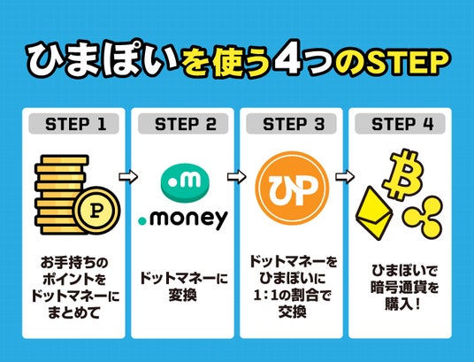また、株式会社サイバーエージェントが提供するポイントプラットフォーム『ドットマネー』において、お客様が貯めた各種サイトのポイントを『ドットマネー』に交換後、『ドットマネー』と『ひまぽい』を交換した上で、暗号資産をご購入頂けます。