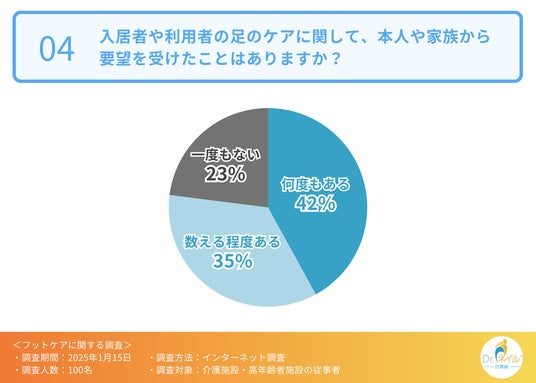 次に、入居者や利用者の足のケアに関して、本人や家族から要望を受けたことはあるか伺ったところ、「何度もある(42.0%)」「数える程度ある(35.0%)」と8割近くが要望されたことがあるいう回答結果となりました。