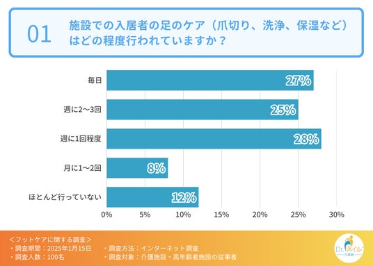 はじめに、施設での入居者の足のケア(爪切り、洗浄、保湿など)はどの程度行われているか伺ったところ、「週に1回程度(28.0%)」「毎日(27.0%)」「週に2~3回(25.0%)」という回答が集まりました。