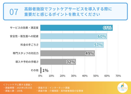 そこで、高齢者施設でフットケアサービスを導入する際に重要だと感じるポイントについて伺ったところ、「サービスの効果・満足度(65.0%)」「安全性・衛生面への配慮(60.0%)」「料金の手ごろさ(57.0%)」「専門スタッフの対応力(49.0%)」という回答が集まりました。