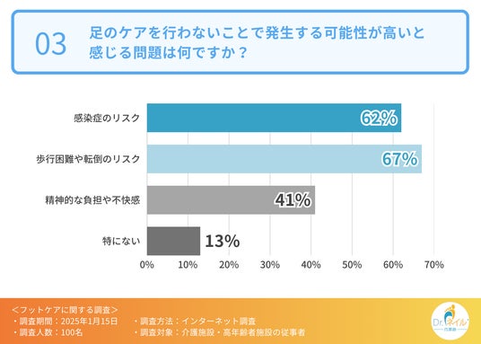 そこで、足のケアを行わないことで発生する可能性が高いと感じる問題について伺ったところ、「歩行困難や転倒のリスク(67.0%)」「感染症のリスク(62.0%)」「精神的な負担や不快感(41.0%)」という回答が集まりました。